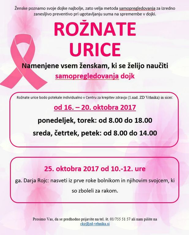 Za vas smo  od 16. do 20. oktobra 2017 pripravili ROŽNATE URICE, ki so namenjene vsem ženskam, ki se želijo naučiti samopregledovanja.