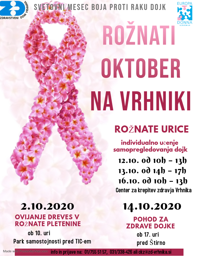 V Združenju Europa Donna Slovenija kljub spremenjenim razmeram tudi letos pripravljajo številne aktivnosti, s katerimi bodo počastili rožnati oktober. Glede na epidemiološko situacijo so več poudarka namenili osveščanju o raku dojk na spletu, na plakatnih mestih in z manjšimi zunanjimi dogodki v krajih po Sloveniji.Tako bo tudi na Vrhniki.