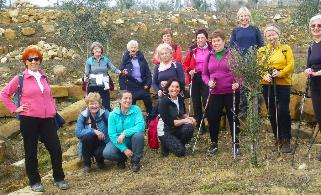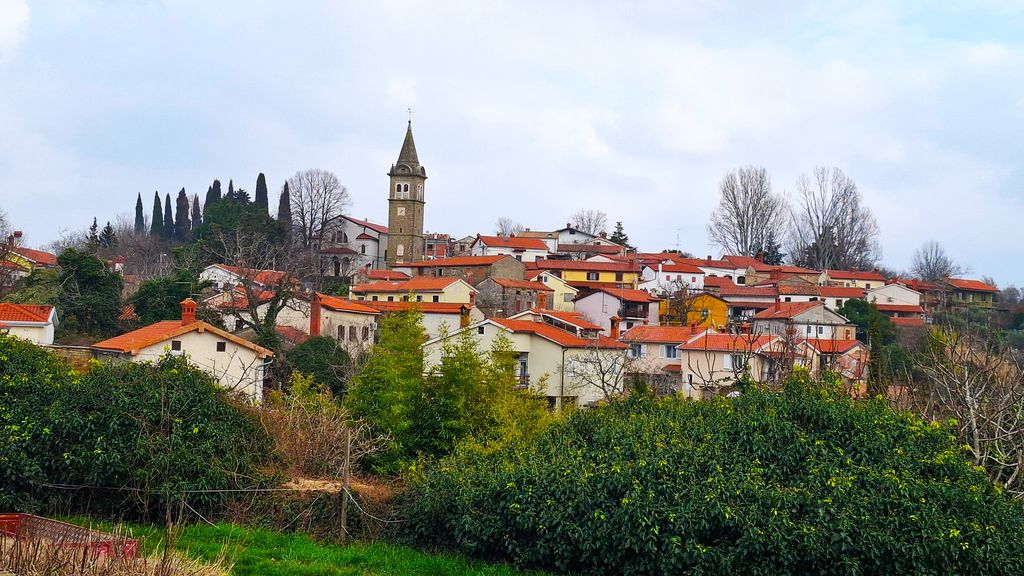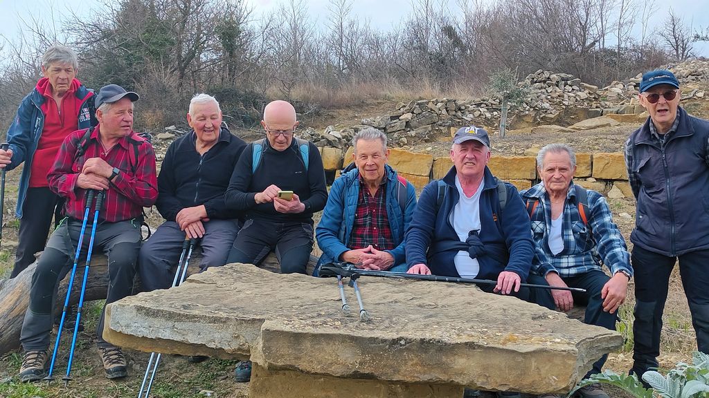 Ustavili smo se pri cerkvici Marijinega rojstva, v katero pa žal nismo mogli pokukati in si ogledati fresk iz 14. stoletja in ostanke glagoljaškega napisa. Sprehodili smo se mimo cerkve sv. Jurija, ki ima visok zvonik, ločen od cerkvene zgradbe. Razgledov z vrha ni bilo zaradi megle v dolini, a smo veselo zakoračili po označeni stezi na »Pot za srce in dušo« med številnimi terasasto urejenimi oljčniki in vinogradi. Vseskozi so nas spremljali suhi zidovi, ki jih je gradilo več generacij pridnih rok, da so preprečevali odplakovanje zemlje, za lažjo obdelavo po ravnem in omejevanje požarov. Mnogo kje je vednozelena ovijalka - bršljan prerasla suhi zid ali pa se povzpela na osamljena drevesa, ker si zagotavlja oporo , in se bohoti v oblike različnih »prikazni«.