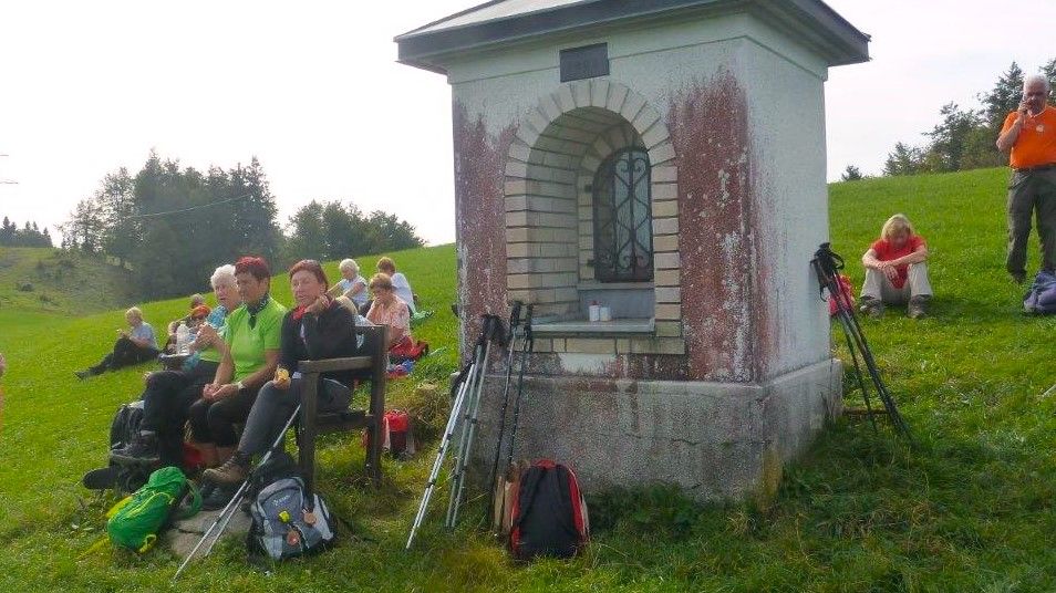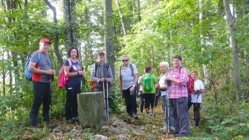 Za kmetijo smo zapustili asfalt in krenili med pašniki po slabšem kolovozu proti vrhu. Prijetno toplo jesensko sonce je pripomoglo k še boljšemu vzdušju, saj so bili pogledi po hribčkih naokoli prav pomirjujoči. Kmalu nas je potka usmerila strmo navzgor proti kapelici, od koder smo uživali v razgledih na nasprotni strani grape proti Blegošu, Poreznu, Kojci in Ratitovcu. Nekaterim je bila že to dovolj velika nagrada, zato so pri kapelici ostali, drugi so se pognali po travnati strmini na vrh, preko katerega je med obema vojnama potekala Rapalska meja, o čemer pričajo še danes mejni kamni.