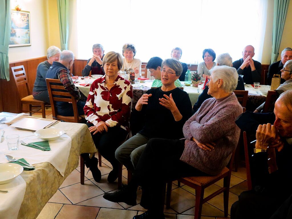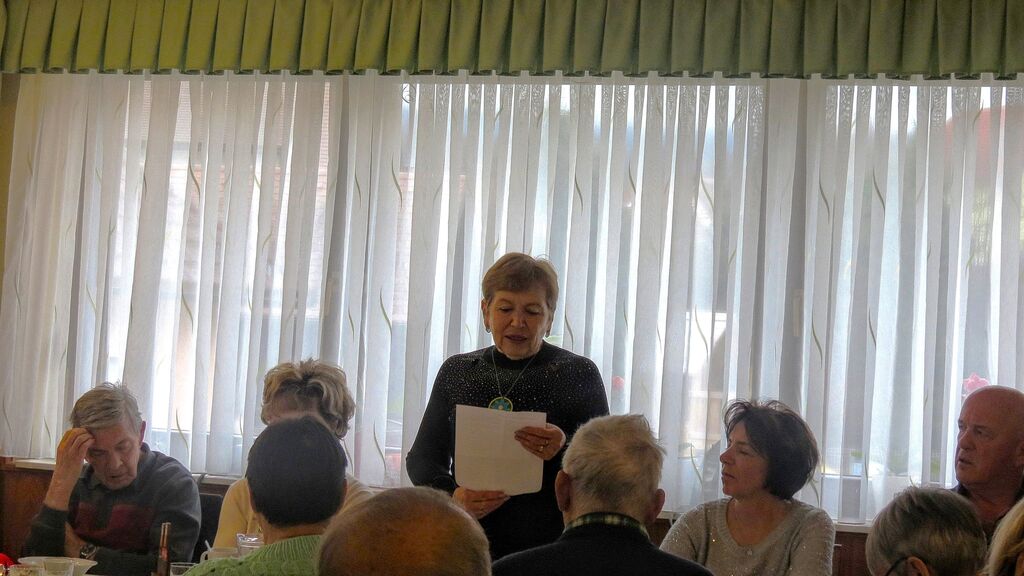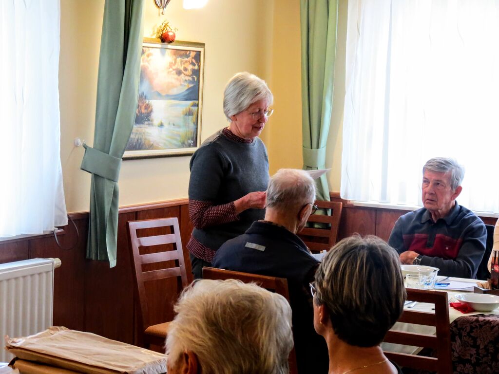 »V letu 2025 smo opravili le 15 pohodov trije so odpadli zaradi slabega vremena. Posameznega pohoda se je udeležilo od 21 do 33 pohodnikov, poprečno 23. Kar nekaj naših udeležencev ima občasne zdravstvene težave in se kljub velikim željam ne more udeleževati pohodov. Tudi leta se že malo poznajo, saj je poprečna starost 77 let, med nami pa je kar 11 pohodnikov starejših od 80 let. … Še vedno imamo težave z vodniki, saj sta nam ostala le Sonja Zalar Bizjak in Jože Školc.« … Na kratko je prestavila vse smeri pohodov in zaključila: »Organizacija pohodov je že ves čas v rokah Elice, ki naša doživetja z izbranimi besedami tudi zapiše za spletno stran in Naš časopis. Željko je na preži skozi celotno pot, da poslika zanimivosti, detajle, naselja, cvetje…in skupino. Marjanca pa skrbno vodi evidenco o plačilih računov za prevoze.« Nato se je vsem in vsakomur posebej zahvalila in zaželela vsem zdravo in srečno leto 2026.