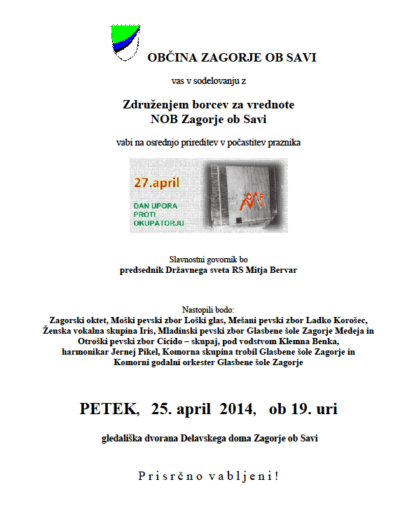 Organizator: Občina Zagorje ob Savi v sodelovanju z Združenjem borcev za vrednote NOB Zagorje ob Savi
