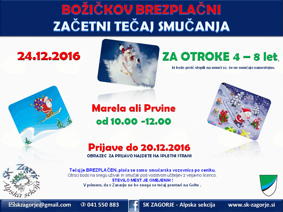 Božičkov brezplačni tečaj smučanja je namenjen vsem otrokom od 4 do 8 let , ki želijo spoznati ta čudoviti zimski šport. Otrokom, ki bodo prviča stopili na smuči oz. še ne smučajo samostojno. Smučanje je igra in mi se zabavamo :) Tečaj je brezplačen, Plača se smučarska vozovnica po ceniku upravljavca smučišča.