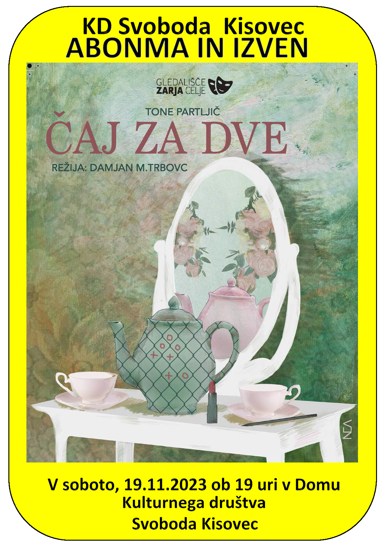 Druga gledališka predstava v sezoni 2022/2023. Lahka komedija ČAJ ZA DVE v izvedbi gledališča ZARJA iz Celja.