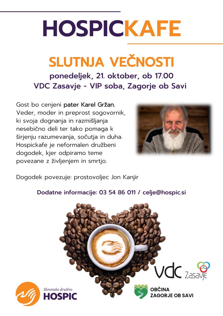 Gost bo cenjeni pater Karel Gržan. Veder, moder in preprost sogovornik, ki svoja dognanja in razmišljanja nesebično deli ter tako pomaga k širjenju razumevanja, sočutja in duha. Hospickafe je neformalen družbeni dogodek, kjer odpiramo teme povezane z življenjem in smrtjo. Dogodek povezuje: prostovoljec Jon Kanjir