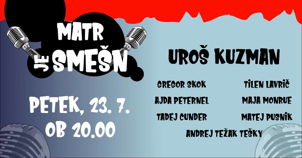 V glavnem, v petek, 23. 7. 2021 ob 20:00 se bomo zagotovo krohotali na igrišču Proletarec pred Mladinskim centrom Zagorje. Dogodek je brezplačen, obiskovalci pa morate izpolnjevati pogoje PCT. V primeru dežja dogodek odpade.