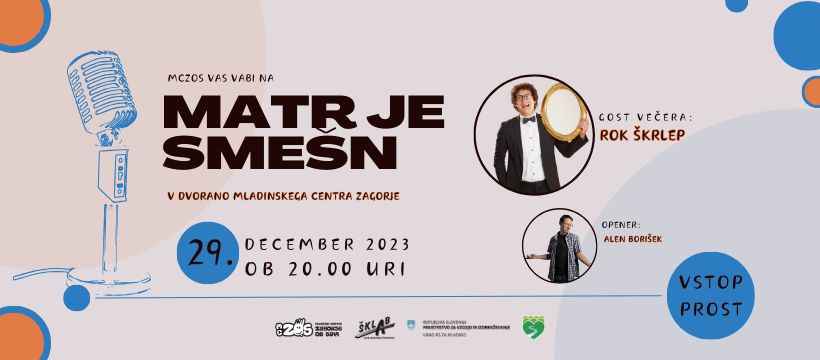 MC ZOS in ŠKLAB vabita še na zadnji dogodek letošnjega leta. Upamo, da ste pripravljeni na smeh, saj na Matr je smešn prvič prihaja Rok Škrlep, ponovno pa se vrača stari znanec, Alen Borišek.