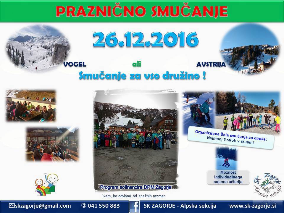 Tudi letos za vas skupaj z DPM Zagorje organiziramo praznični smučarski izlet . Smučanje je namenjeno tako družinam , kot posameznikom . Za brezskrbno smučanje staršev bo organizirana tudi šola smučanja za otroke.