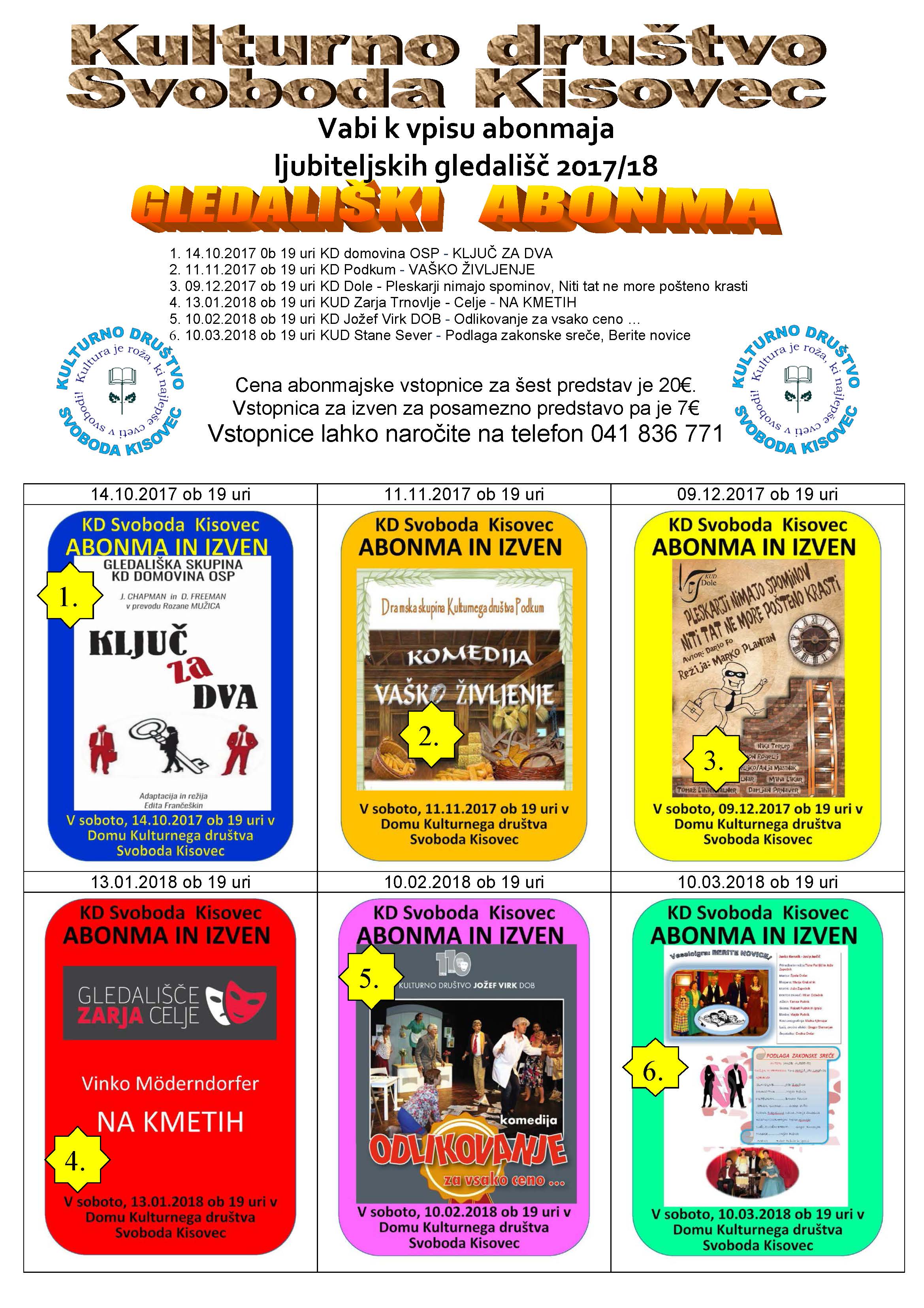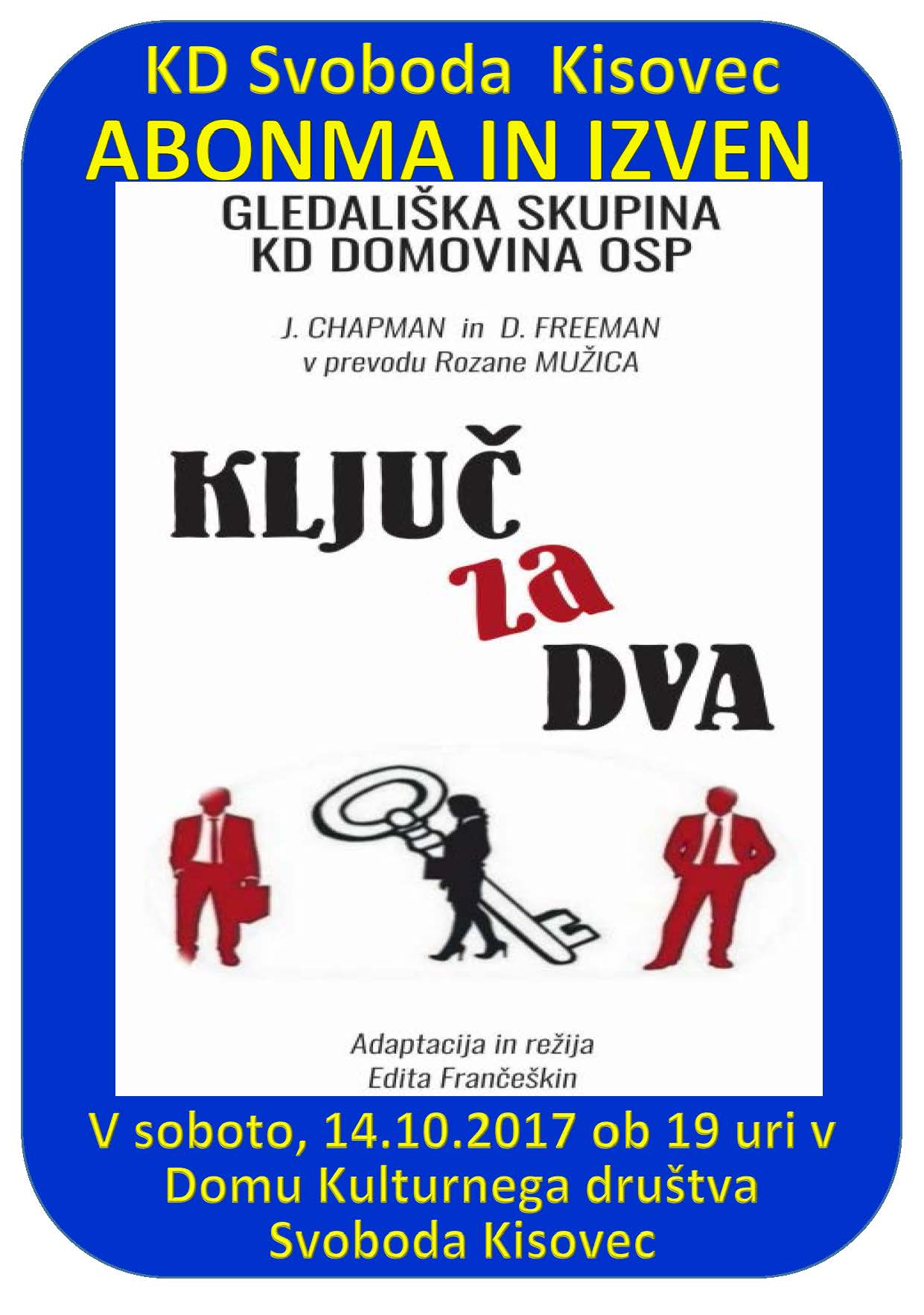 Vabimo vas na prvo gledališko abonmajsko predstavo 14.10.2017 ob 19 uri v dvorani Kulturnega društva Svoboda Kisovec.