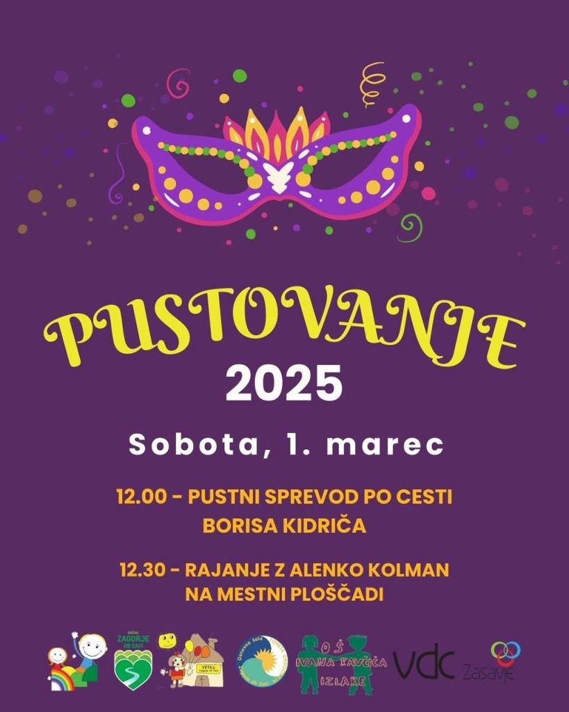 Občina Zagorje ob Savi in Društvo prijateljev mladine Zagorje vabita na pustni sprevod, ki bo v soboto, 1. marca, ob 12. uri krenil po Cesti Borisa Kidriča. Na čelu povorke bo tudi tokrat Pihalni orkester Svea Zagorje. Ob 12.30 bo na mestni ploščadi sledila zabava z Alenko Kolman, maškare pa se bodo lahko posladkale s pustnimi krofi.