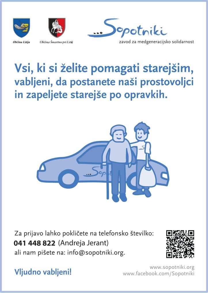 Opis prostovoljskega dela: Opravljanje prevozov z namenskim vozilom v okviru izvajanja storitve brezplačnih prevozov za starejše Sopotniki. Odločiš se, kateri dan v tednu bi želel pomagati starejšim, se vpišeš v spletni koledarček dežurstev in na dogovorjeni prostovoljski dan, na dogovorjenem mestu, prevzameš službeno vozilo in službeni telefon. Po razporedu voženj (prejmeš ga dan prej) odpelješ starejše po opravkih, po potrebi nudiš spremstvo, med prevozom se pogovarjaš, s Sopotnikom si izmenjata izkušnje, nasvete, zgodbe. Spoznavaš nove ljudi in kraje ter bogatiš svoje znanje z usposabljanji, ki jih nudi naš zavod. Za podporo na poti, ti je ves čas na voljo mentorica oz. koordinatorka enote Litija in Šmartno pri Litiji.