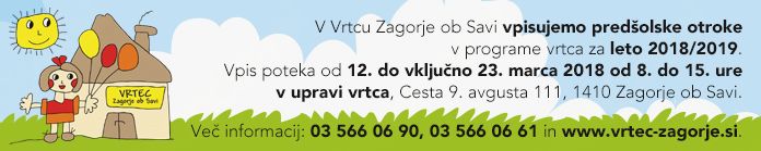 V Vrtcu Zagorje ob Savi vpisujemo predšolske otroke v programe vrtca za leto 2018/2019. Vpis poteka od 12. do vključno 23. marca 2018 od 8. do 15. ure v upravi vrtca, Cesta 9. avgusta 111, 1410 Zagorje ob Savi.