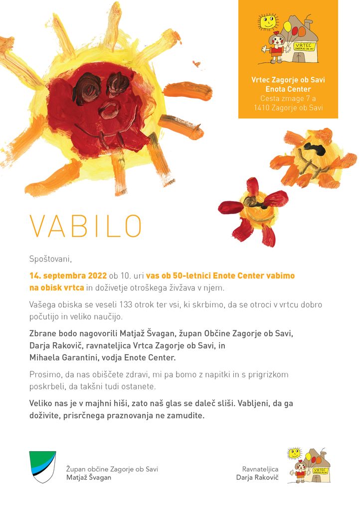 Občina Zagorje ob Savi in Vrtec Zagorje ob Savi Enota Center vas ob 50-letnici Enote Center vabita 14. septembra 2022 ob 10. uri na obisk vrtca in doživetje otroškega živžava v njem.