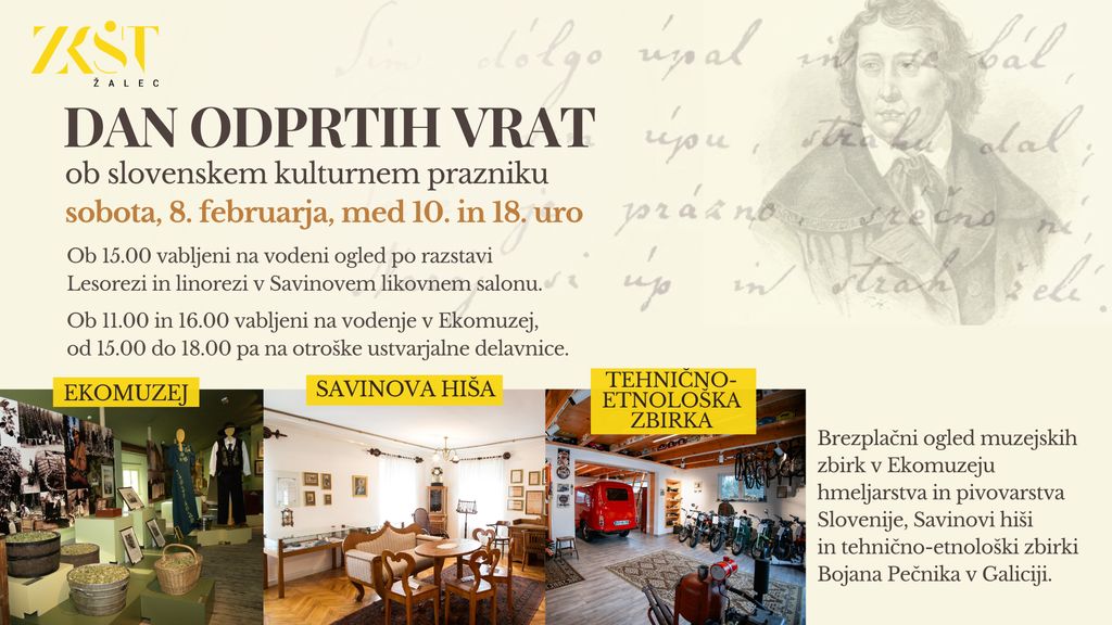 - Savinova hiša: ob 15.00 vabljeni na javni vodeni ogled po razstavi Lesorezi in linorezi avtorja Mihe Eriča v Savinovem likovnem salonu.