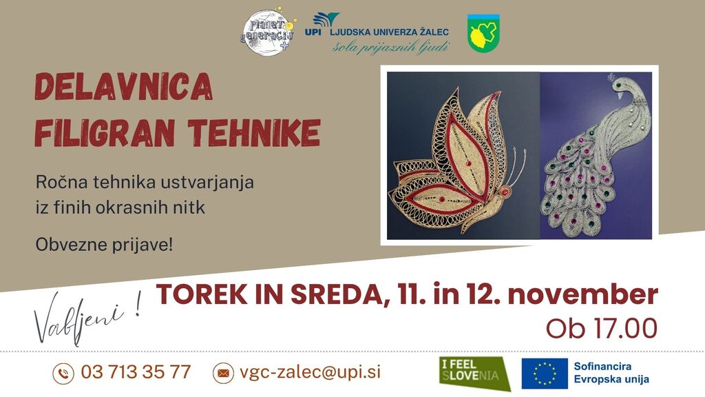 Vabljeni na delavnico filigran tehnike, ročne tehnike ustvarjanja iz finih okrasnih nitk, na kateri boste oblikovali nežne vzorce in dekoracije s pridihom tradicionalne umetnosti. Potekala bo v dveh delih in sicer v torek 11. in četrtek, 12. novembra, ob 17.00 uri v Večgeneracijskem centru Planet generacij+, UPI - ljudske univerze Žalec.