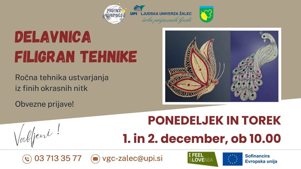 Vabljeni na delavnico filigran tehnike, ročne tehnike ustvarjanja iz finih okrasnih nitk, na kateri boste oblikovali nežne vzorce in dekoracije s pridihom tradicionalne umetnosti. Potekala bo v dveh delih in sicer v torek 27. in četrtek, 29. 5. 2025 ob 16.30 uri v Večgeneracijskem centru Planet generacij+, UPI- ljudske univerze Žalec.