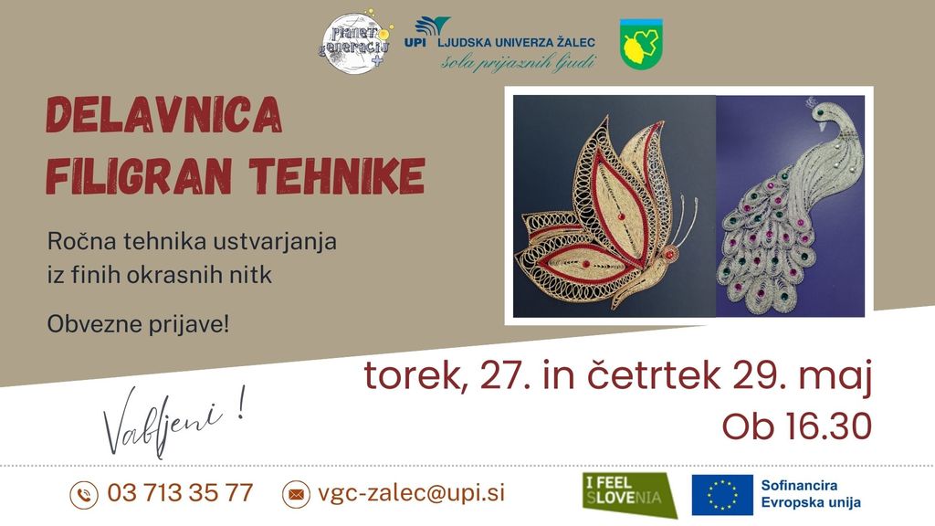 Vabljeni na delavnico filigran tehnike, ročne tehnike ustvarjanja iz finih okrasnih nitk, na kateri boste oblikovali nežne vzorce in dekoracije s pridihom tradicionalne umetnosti. Potekala bo v dveh delih in sicer v torek 27. in četrtek, 29. 5. 2025 ob 16.30 uri v Večgeneracijskem centru Planet generacij+, UPI- ljudske univerze Žalec.