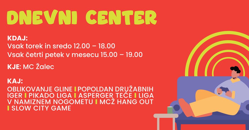 Dnevni center za mlade je odprt vsak torek in sredo od 12.00 do 18.00 ter vsak četrti petek v mesecu od 15.00 do 19.00.
