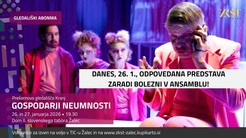 Za ponedeljek, 26. januarja 2026, napovedana predstava pa zaradi bolezni v ansamblu, žal odpade.