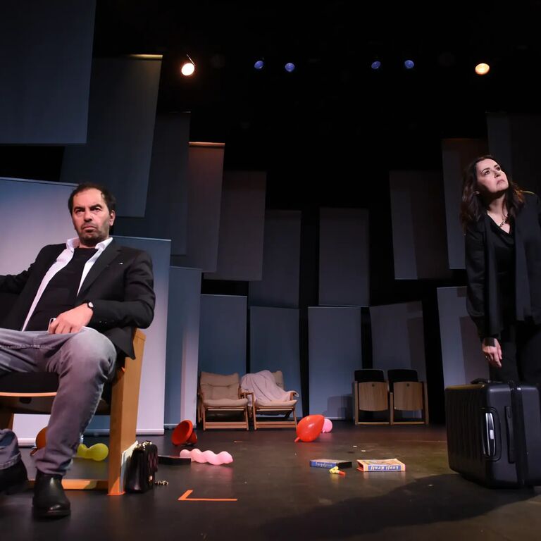 Mož in žena – bolje žena in mož, kajti vendarle je ona »zvlekla« njega v gledališče; kakor pač že tolikokrat doslej – sedita v dvorani in čakata, da se bo predstava pričela. Še pred začetkom se spričkata; nekaj okoli parkiranja in gledališkega lista, ali ga potrebujeta ali ne. Ona pravi, da ga bo potem prebrala, on, da ga še nikoli ni in da bo tudi tokrat končal v košu za smeti.