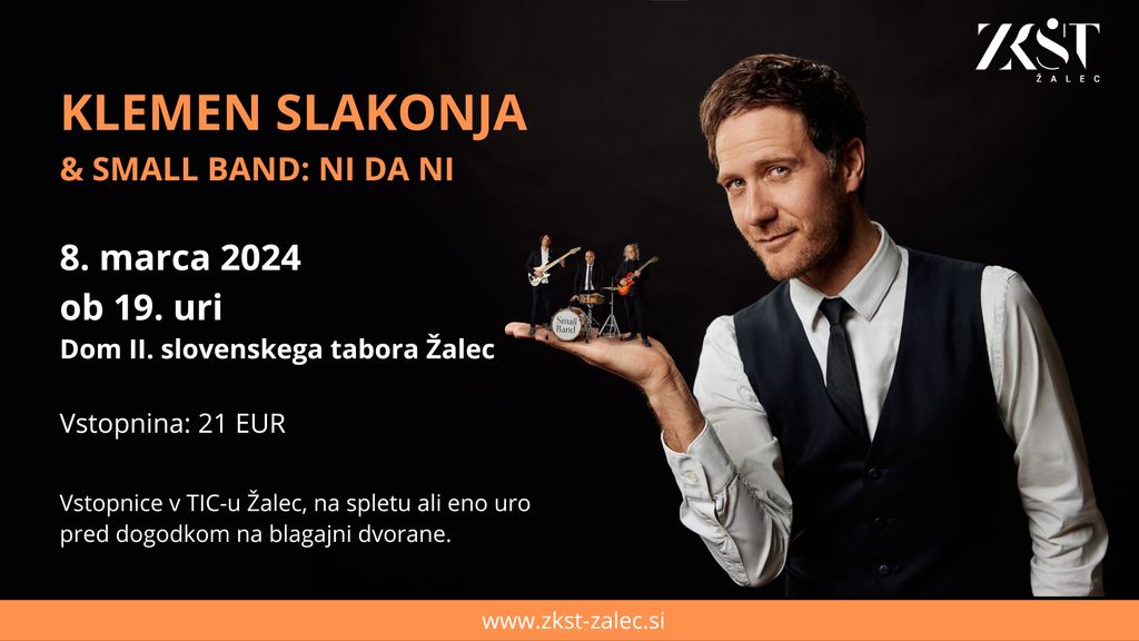 Vabimo vas na vrhunski koncert slovenskega priljubljenega igralca in interpreta Klemna Slakonje, ki v Žalec prihaja z glasbeno zasedbo Small Band.