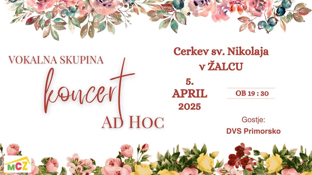 Vljudno vabljeni na Koncert Vokalne skupine Ad Hoc, ki bo 5. aprila v cerkvi Sv. Nikolaja v Žalcu. Koncert bomo izvedli skupaj z našimi prijateljicami iz zamejstva DVS Primorsko iz Mačkolj pri Trstu.