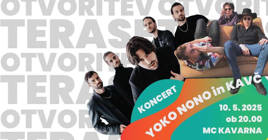 Pomlad je tu, terasa je ready, čas je za žur! Pridruži se nam na otvoritvenem koncertu nove sezone na terasi MC Kavarne v Žalcu! Prvič letos na prostem, v živo! Na oder prihajata zasedbi Yoko Nono in Kavč. Izjemni glasbeniki bodo poskrbeli za nepozaben večer!