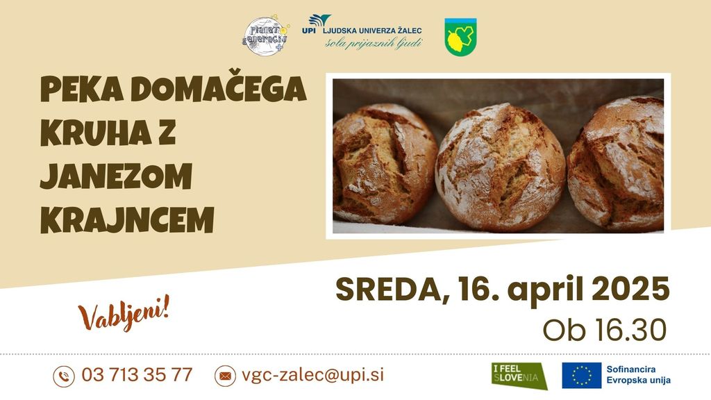 Vabimo vas na prijetno in dišečo delavnico peke domačega kruha z Janezom Krajncem, ki bo z nami delil svoje znanje, izkušnje in trike za popolno skorjo in mehko sredico!