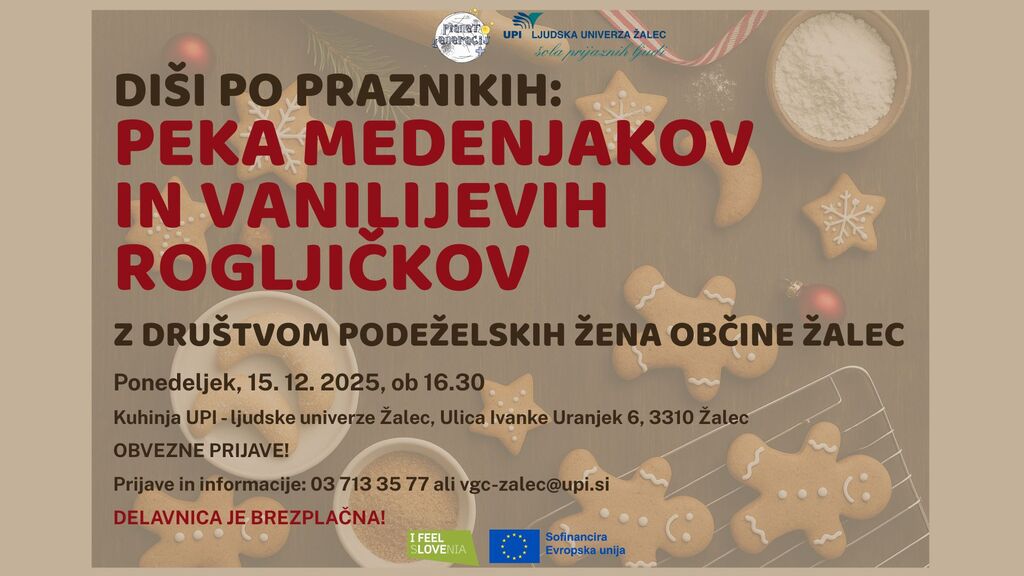 Večgeneracijski center Planet generacij+ UPI Žalec vas z velikim veseljem vabi na slastno, dišečo in ustvarjalno delavnico praznične peke, kjer bomo skupaj zakorakali v čarobni svet domače kulinarike. Pod skrbnim in izkušenim vodstvom članic Društva podeželskih žena Občine Žalec bomo pripravili tradicionalne medenjakove piškote ter nežne, omamno dišeče vanilijeve rogljičke, ki so nepogrešljiv del prazničnih dni.