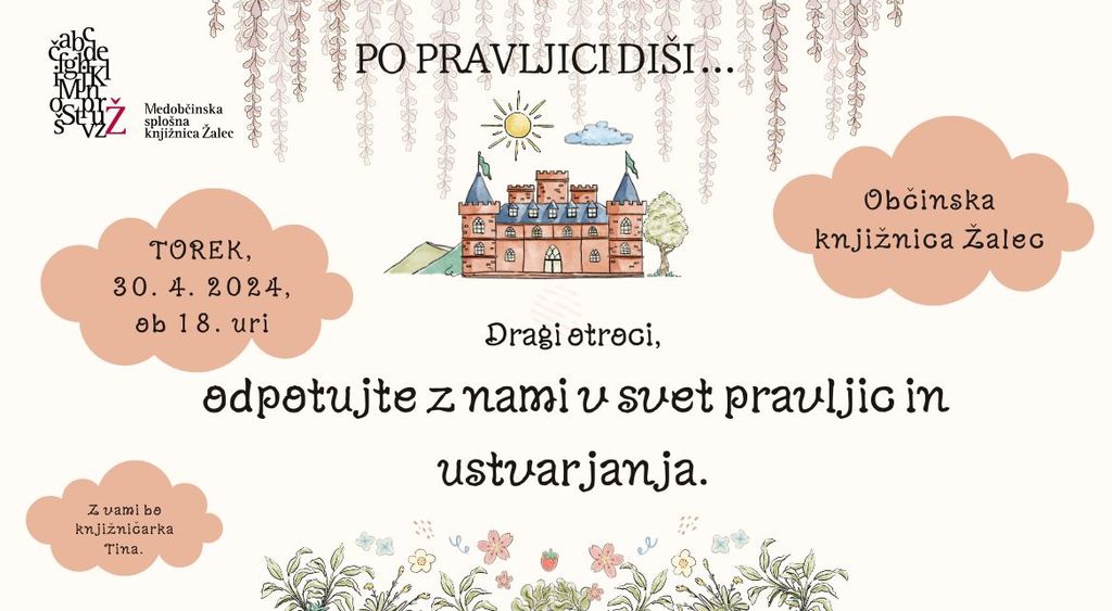 odpotujte z nami v svet pravljic in ustvarjanja. Vabljeni v torek, 30. aprila 2024, ob 18. uri v Občinsko knjižnico Žalec na pravljično uro.