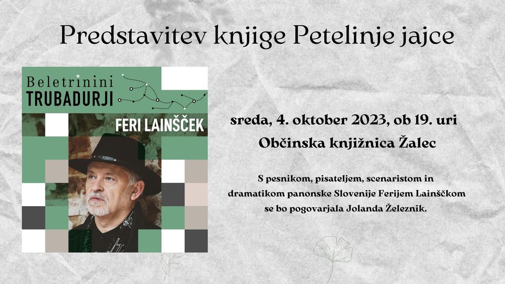 Vabljeni na predstavitev knjige Petelinje jajce, ki bo v sredo, 4. oktobra 2023, ob 19. uri v Občinski knjižnici Žalec.