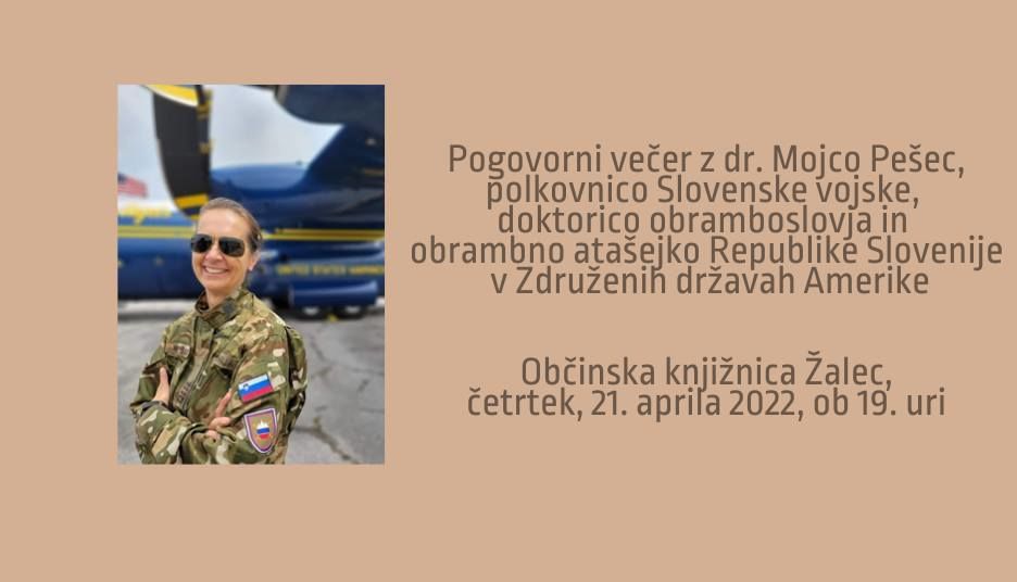 S polkovnico Slovenske vojske, doktorico obramboslovja, obrambno atašejko Republike Slovenije v Združenih državah Amerike, se bo pogovarjala Jolanda Železnik, direktorica Medobčinske splošne knjižnice Žalec.