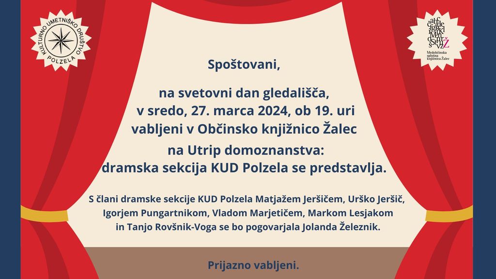 na svetovni dan gledališča, v sredo, 27. marca 2024, ob 19. uri vabljeni v Občinsko knjižnico Žalec na Utrip domoznanstva: dramska sekcija KUD Polzela se predstavlja.