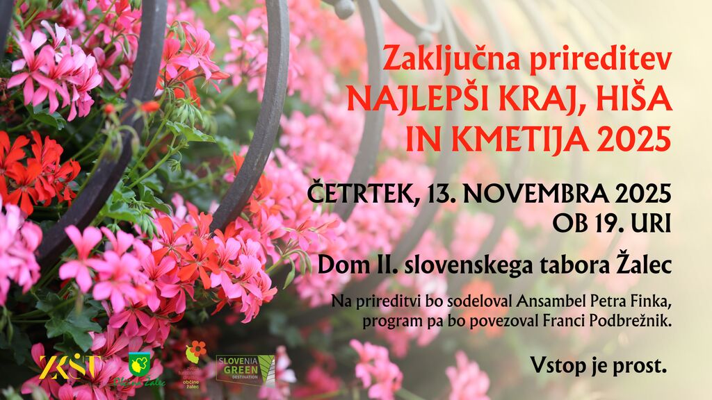Vabimo vas, da se nam pridružite na zaključni prireditvi izbora Najlepši kraj, hiša in kmetija, ki bo potekala v četrtek, 13. novembra 2025, ob 19. uri v Domu II. slovenskega tabora Žalec.