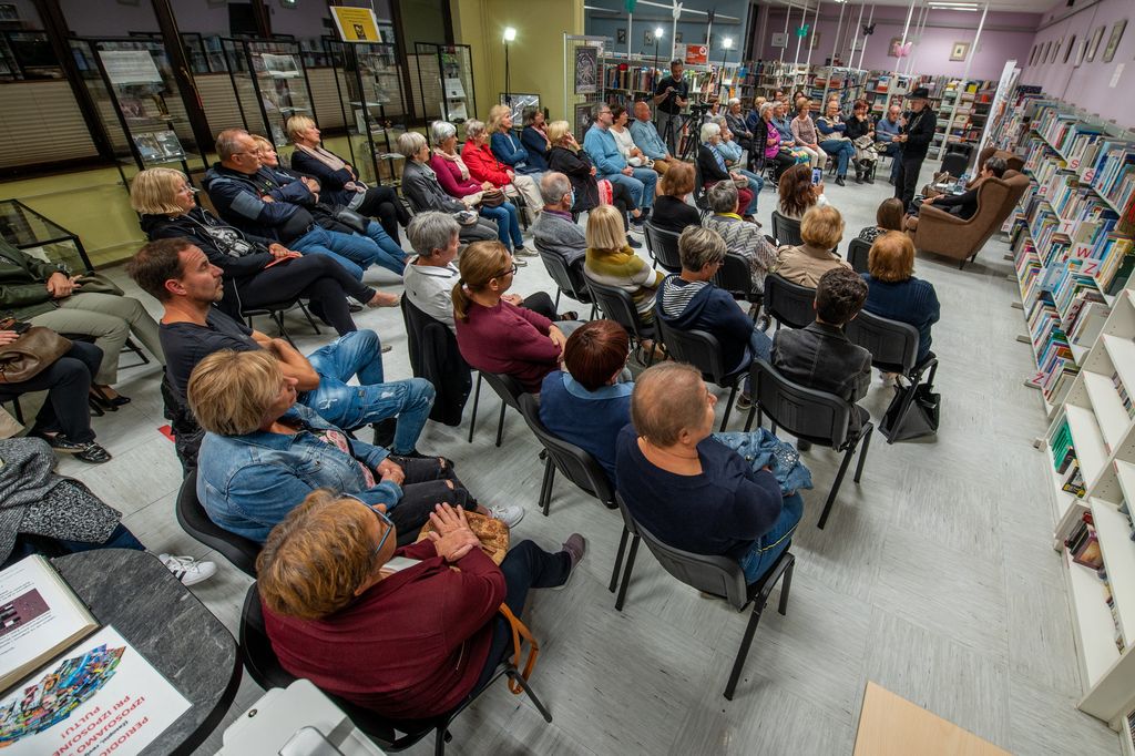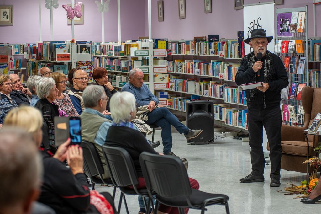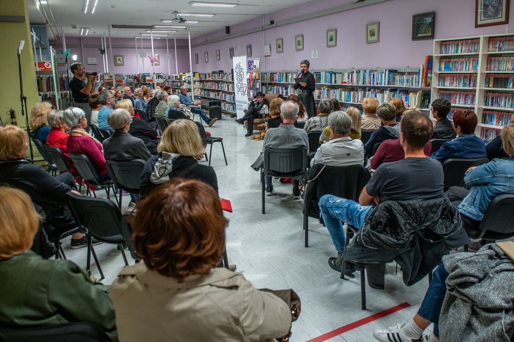 Nabito polno žalsko knjižnico je pisatelj na koncu navdušil tudi z recitiranjem pesmi v prekmurščini.