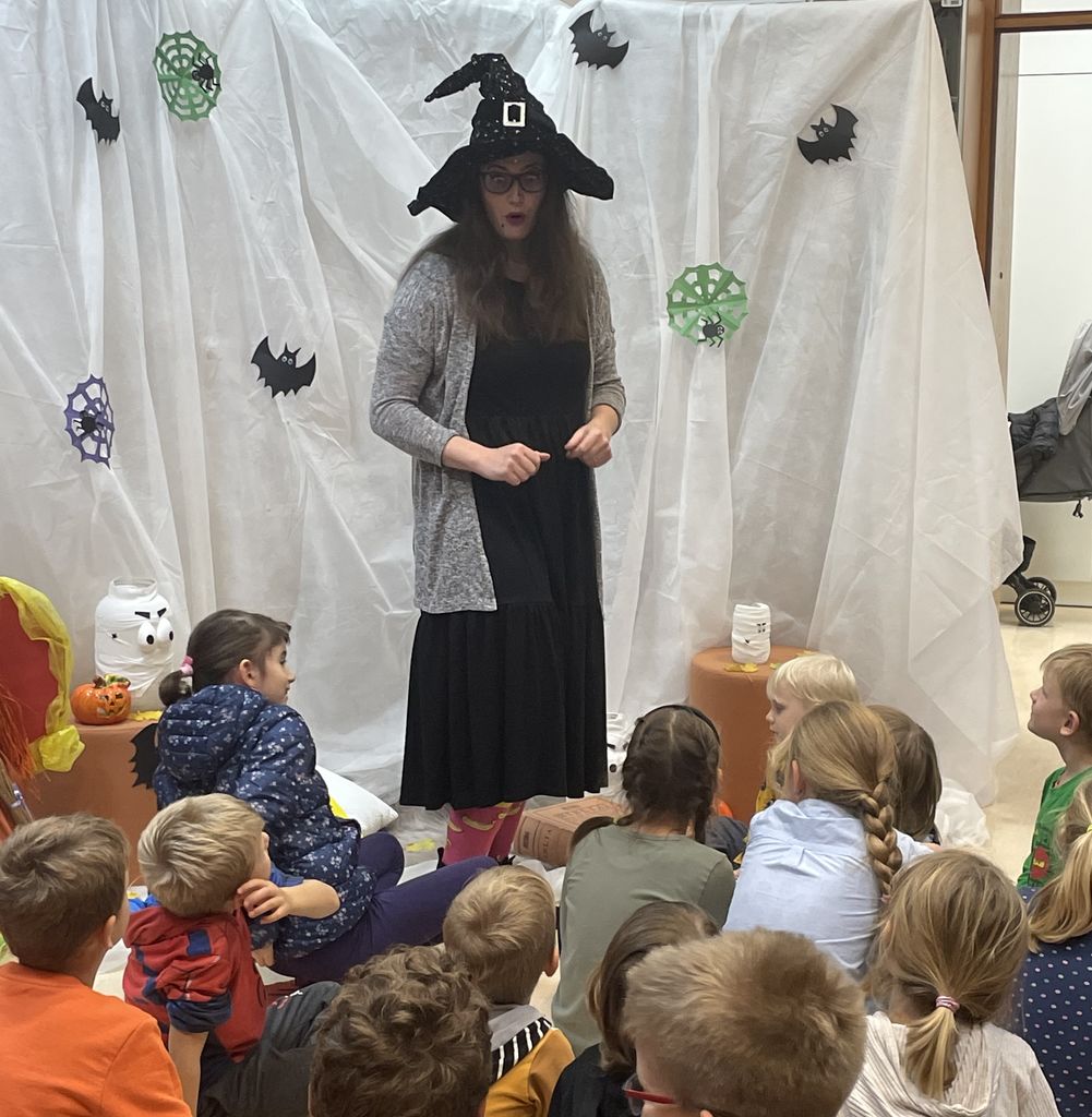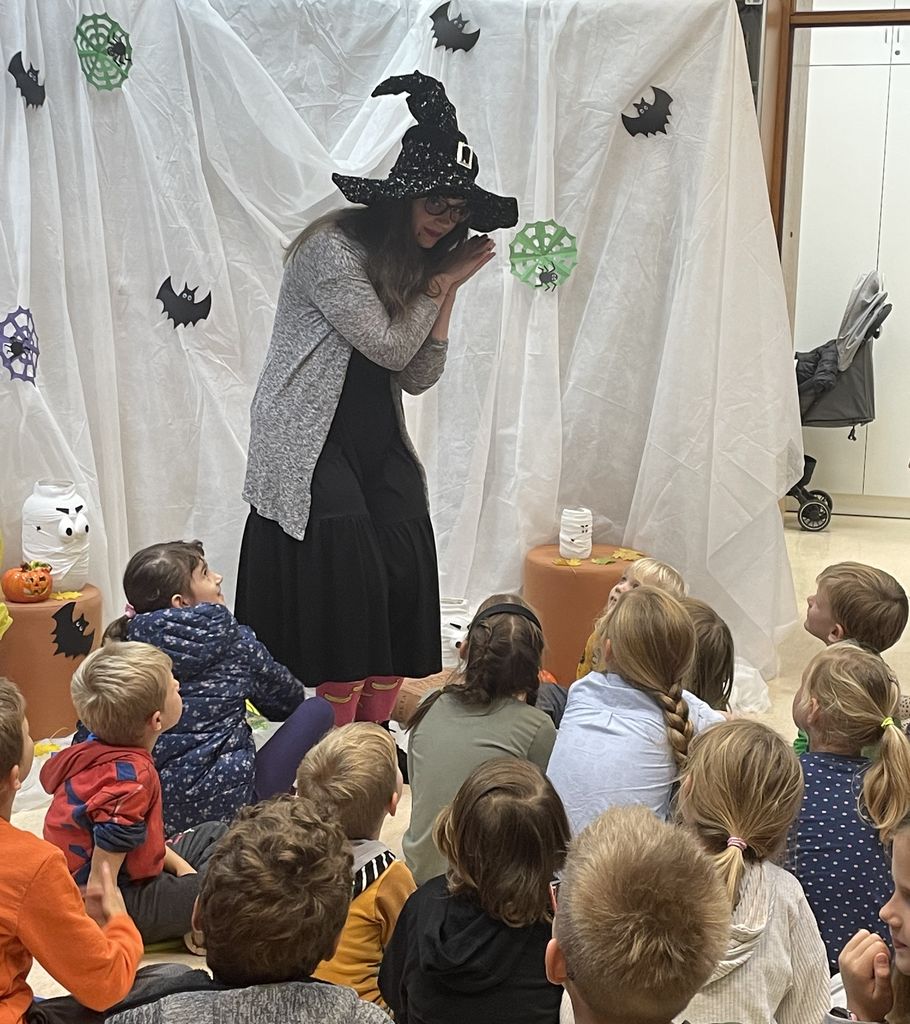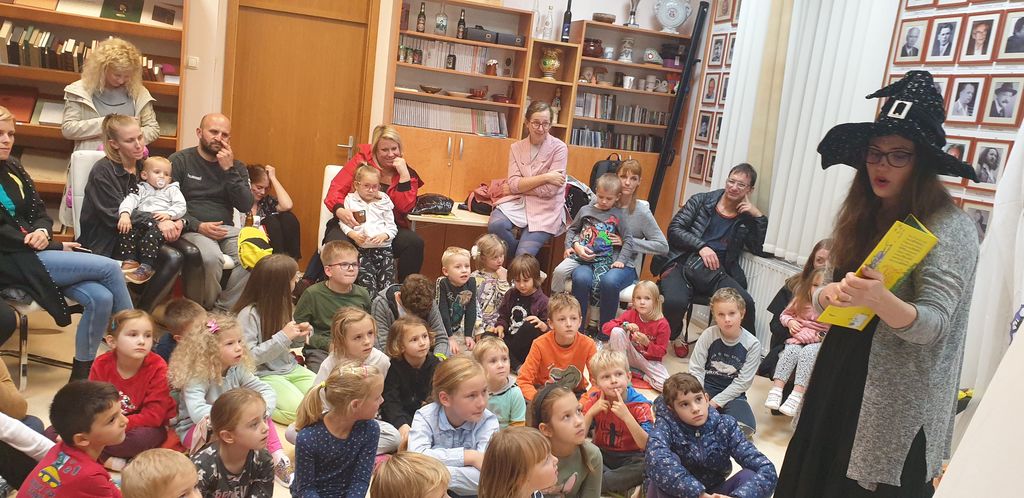 Na jesenski pravljični uri v Občinski knjižnici Žalec nas je v torek, 25. oktobra 2022, obiskala prav posebna čarovnica Tinolina, ki podnevi spi, ponoči pa med knjižnimi policami prebira knjige.