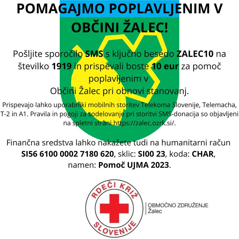 Pošljite sporočilo SMS s ključno besedo ZALEC10 na 1919 in prispevali boste 10 eur za pomoč poplavljenim v Občini Žalec pri obnovi stanovanj.