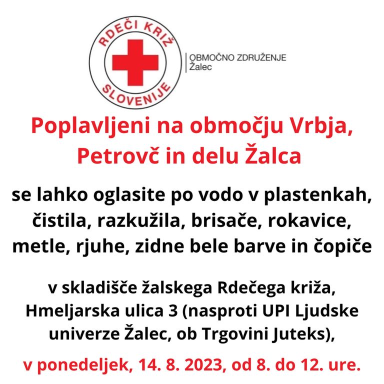 Poplavljeni na območju Petrovč, Vrbja in delu Žalca se lahko oglasite po materialno pomoč: vodo v plastenkah, čistila, razkužila, brisače, rokavice, metle, rjuhe, zidne bele barve in čopiče,
