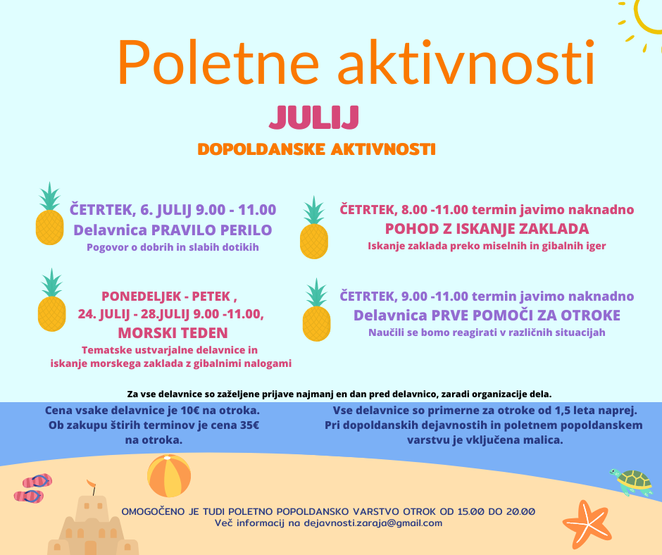 Julija bomo dopoldanske aktivnosti začeli z delavnico "PRAVILO PERILO", kjer se bomo preko zgodbe in pogovora učili o dobrih in slabih dotikih, kdo se nas lahko dotika in kako ukrepati, če nam je neprijetno.