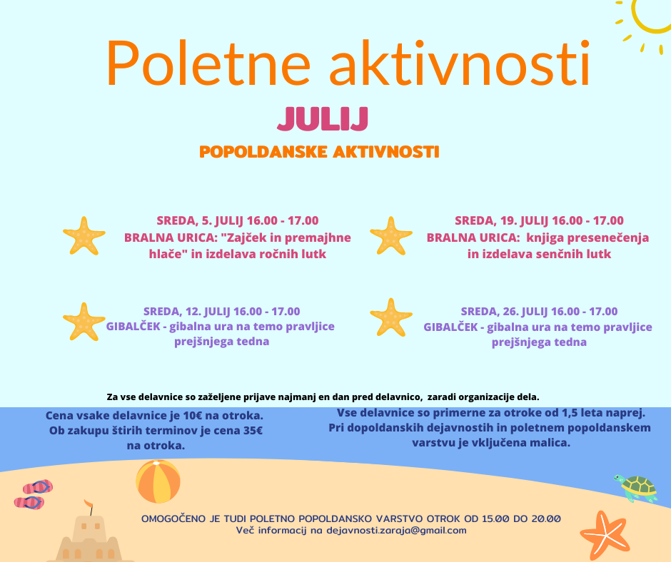 Popoldanske aktivnosti bodo usmerjene v BRALNE DELAVNICE z ustvarjanjem lutk in senčnih lutk, ter v gibalne urice - GIBALČEK, kjer se bodo mešale različne športne zvrsti.