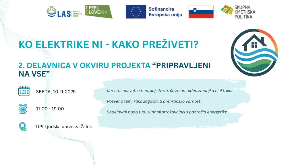 Združenje EKOCI v sodelovanju s partnerji – Občino Žalec, Razvojno agencijo Savinja in Zdravstvenim domom dr. Jožeta Potrate Žalec – vabi na delavnico: KO ELEKTRIKE NI - KAKO PREŽIVETI?
