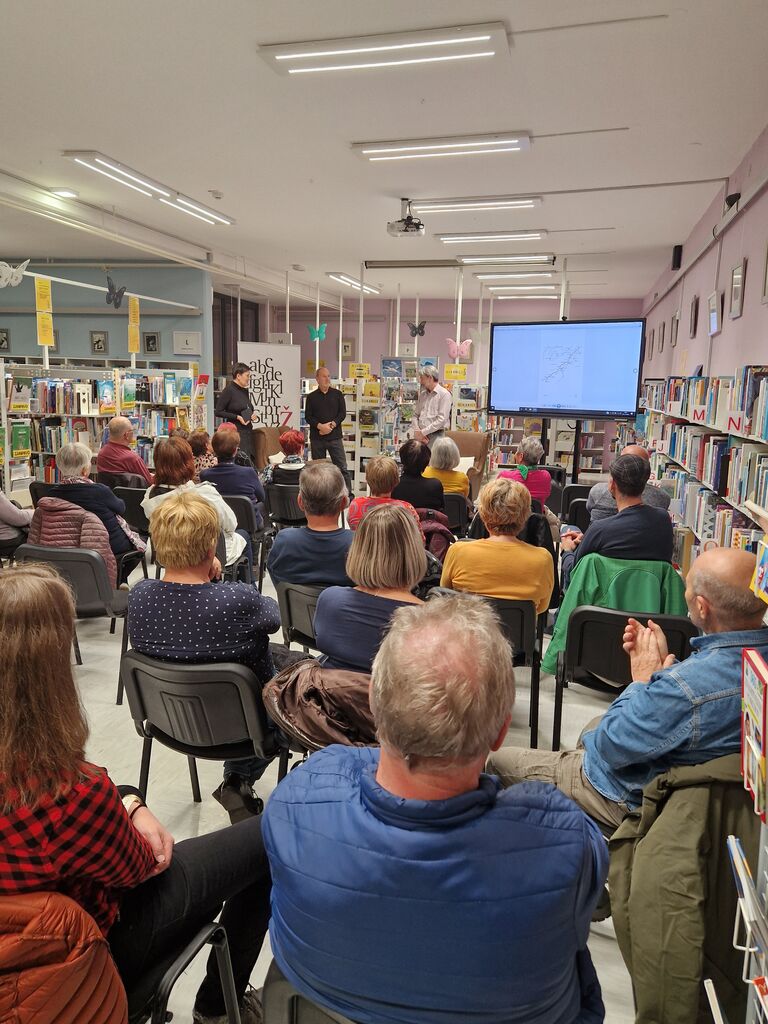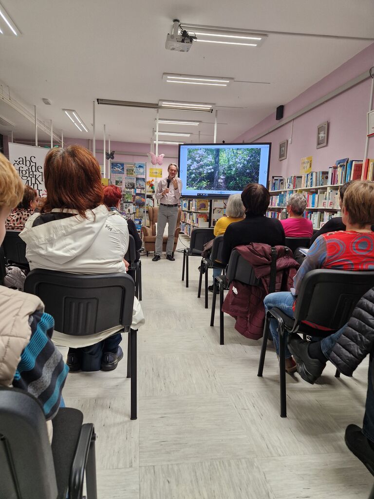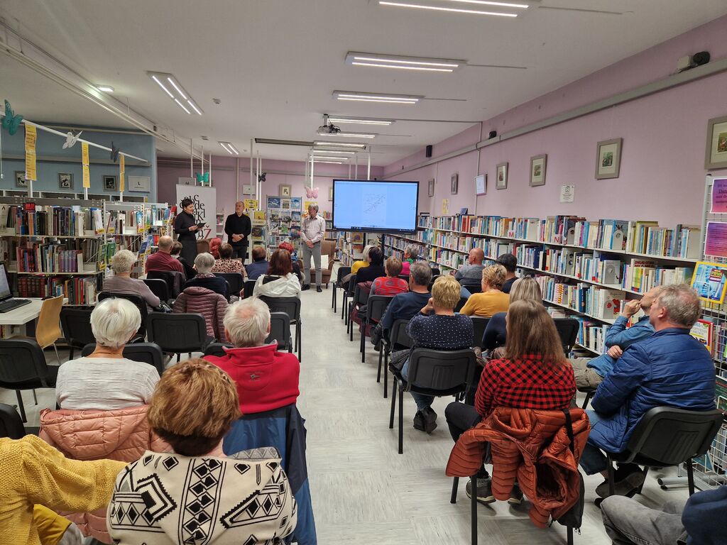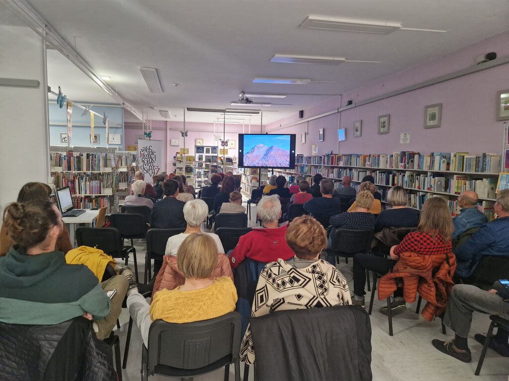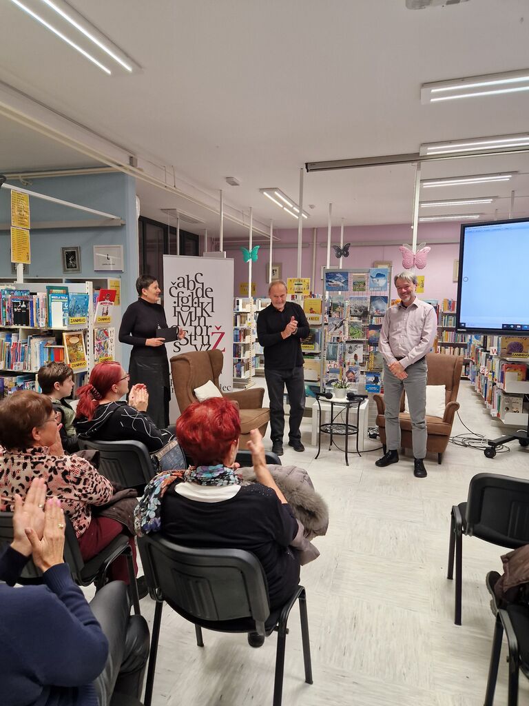 V ponedeljek, 10. novembra 2025, smo bili v Občinski knjižnici Žalec udeleženi v navdihujočem večeru s priznanim alpinistom Vikijem Grošljem in literarnim popotnikom Jakobom Kendo, ki sta nas popeljala po poteh, ki sta jih prehodila in opisala v svojih knjigah. Te so vodile Grošlja od himalajskega visokogorja Križa čez Nepal, prostranstev Arktike in Antarktike iz Mojih 33 odprav do najvišjih domačih vršacev Krone Slovenije in Kendo do ameriškega sredogorja Apalaške poti, celotnega vpogleda v Slovenijo iz Transverzale ter priljubljenih poti po Skandinaviji in Britanskem otočju iz potopisnega romana Evropa: sever, severozahod. Pri tem sta se dotaknila še številnih drugih pozitivnih plati hoje ter opisala svoje osebne motive in razloge, ki so ju vodili na pohode, predstavljene v besedi in sliki. Prelistali pa smo lahko še čisto svežo slikanico Jakoba Kende z ilustracijami Eve Margon Štanta, »ki bi jo morali imeti na nočni omarici vsi Slovenci, a še posebej najstniki in njihovi starši. Prvi, ker so ravno pravih let, da prehodijo vsaj daljši kos slovenske krožne Transverzale. Drugi, ker jih morajo popeljati po njej« (Kenda).