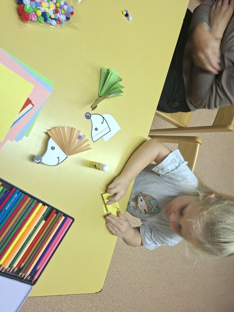 Po končani zgodbi so se otroci lotili ustvarjanja. Z velikim veseljem in navdušenjem so nastajali pisani ježki, vsak s svojim posebnim videzom in značajem.