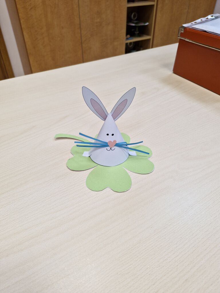 Po pripovedovanju so otroci z veseljem ustvarjali. Iz papirja so izdelali prikupne zajčke, ki sedijo na štiriperesni deteljici. Spretno so lepili in oblikovali dolga ušesa, narisali očke ter dodali barvite brčice. Vsak zajček je bil poseben in unikaten.