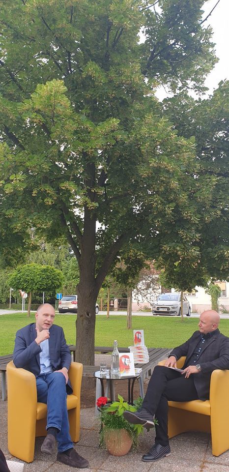 Vonj cvetoče lipe se je prijetno prepletal z besedami, ki so polnile pomladni večer. Z avtorjem knjige Slepec Mitjo Čandrom se je pogovarjal mag. Marko Repnik, direktor JSKD. Zanimivo zgodbo, kako je roman nastal in kaj opisuje, je dopolnil duhovit Repnikov opis sogovornika s stavki, kot so: »Mitja ima odlične retorične sposobnosti, ve kaj reči in kdaj reči. Predvsem pa vedno reče. Direktno in brez ovinkarjenj ...«
