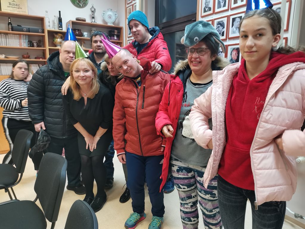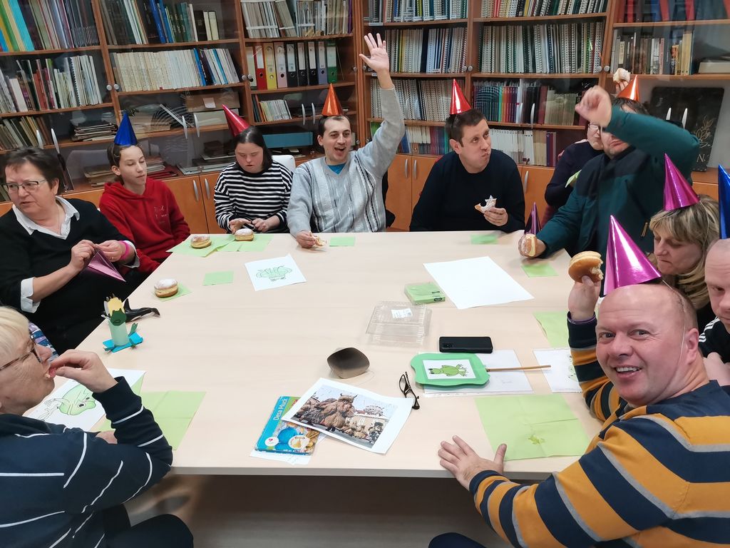 Iz Sožitja so prišli z nekoliko norčavimi nasmehi na obrazu, kot se za pustni čas tudi spodobi. Ena krokodilka je bila vmes, ta je bila zadržana. A le na začetku, ko je morala biti strašljiva. Nadeli smo si kapice iz papirja in se posladkali s krofi, vse v koraku s pustnim torkom, ki je čakal pred vrati. Predstavili smo kurenta, najbolj prepoznavno slovensko masko. Tudi v zgodbi o Anici Dese Muck Skrivnostna maska je imel kurent svojo vlogo. Glede na široko razprte poglede so si verjetno predstavljali, kako največji kurent drži Anico za roke in kako strah jo je. A ne dolgo. Reši jo skrivnostni princ, za katerega se na koncu izkaže, da je njen očka.
