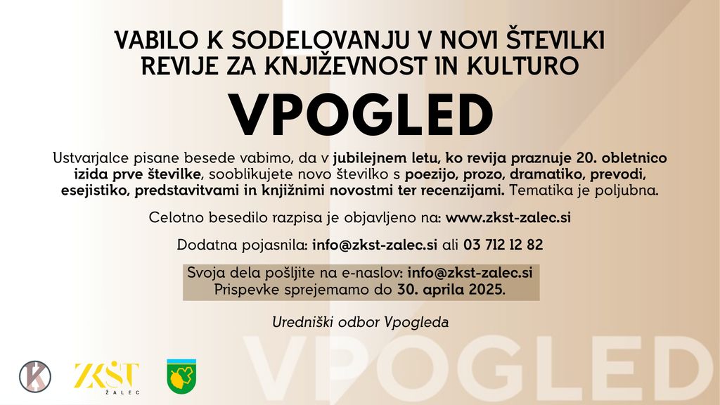 S svojimi prispevki lahko v jubilejnem letu, ko revija praznuje 20. obletnico izida prve številke, oblikujete novo številko revije za književnost in kulturo Vpogled (letnik XXI, številka 27), ki jo izdaja ZKŠT Zavod za kulturo, šport in turizem Žalec.