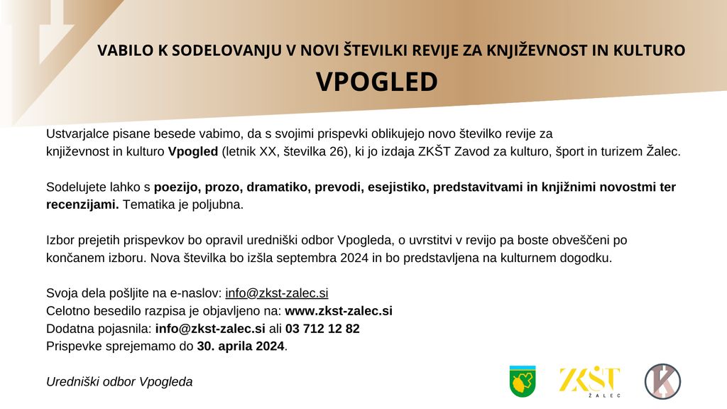 Ustvarjalce pisane besede vabimo, da s svojimi prispevki oblikujejo novo številko revije za književnost in kulturo Vpogled (letnik XX, številka 26), ki jo izdaja ZKŠT Zavod za kulturo, šport in turizem Žalec.
