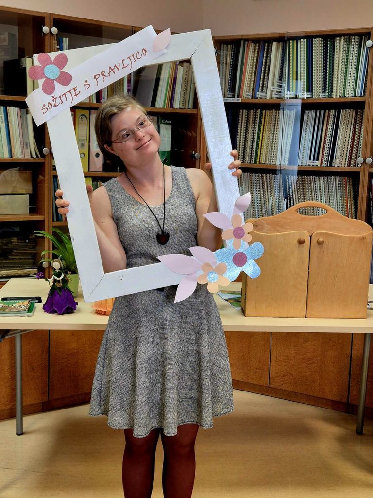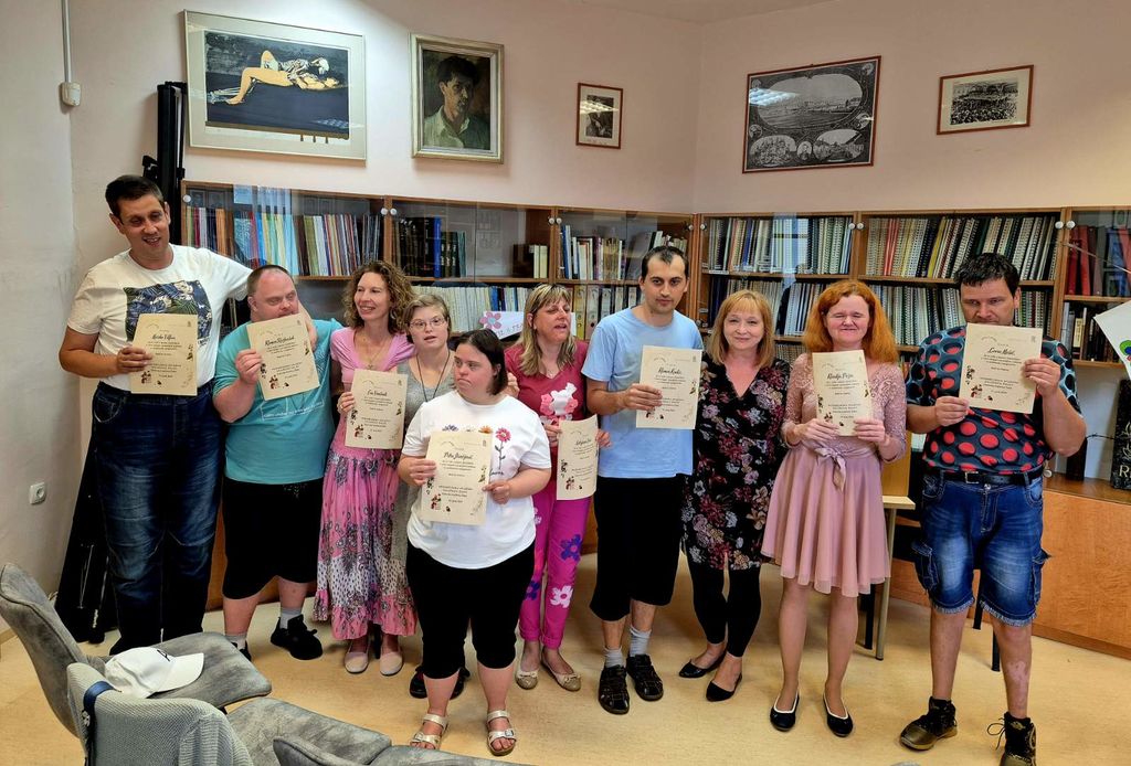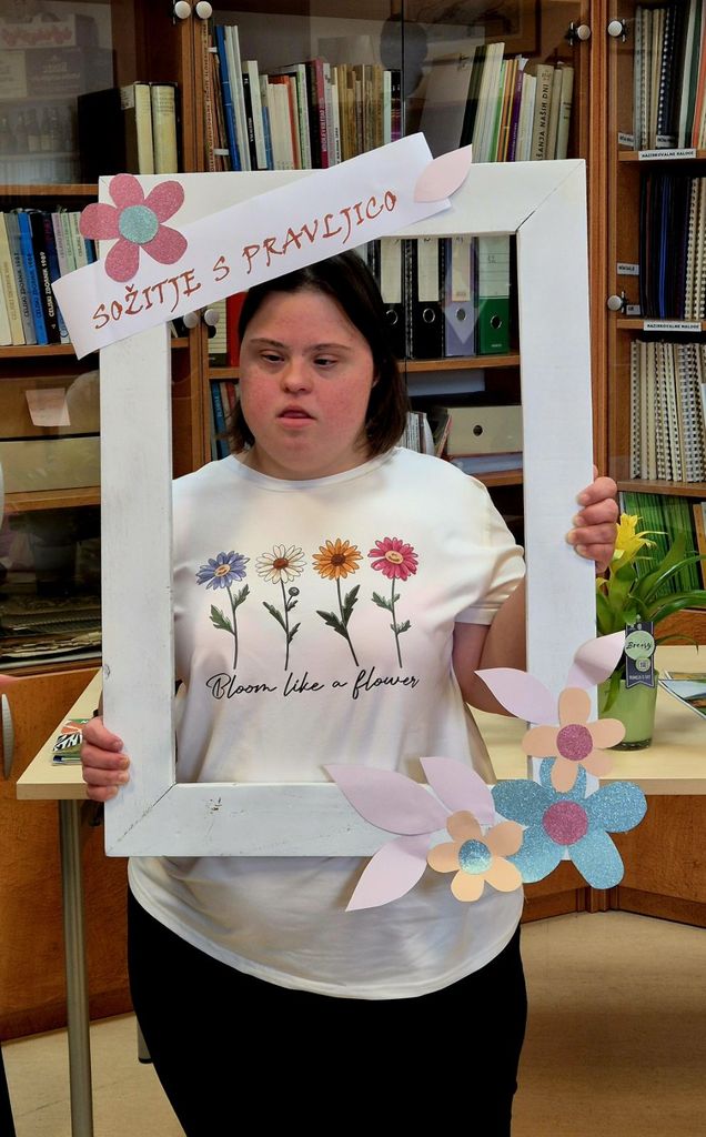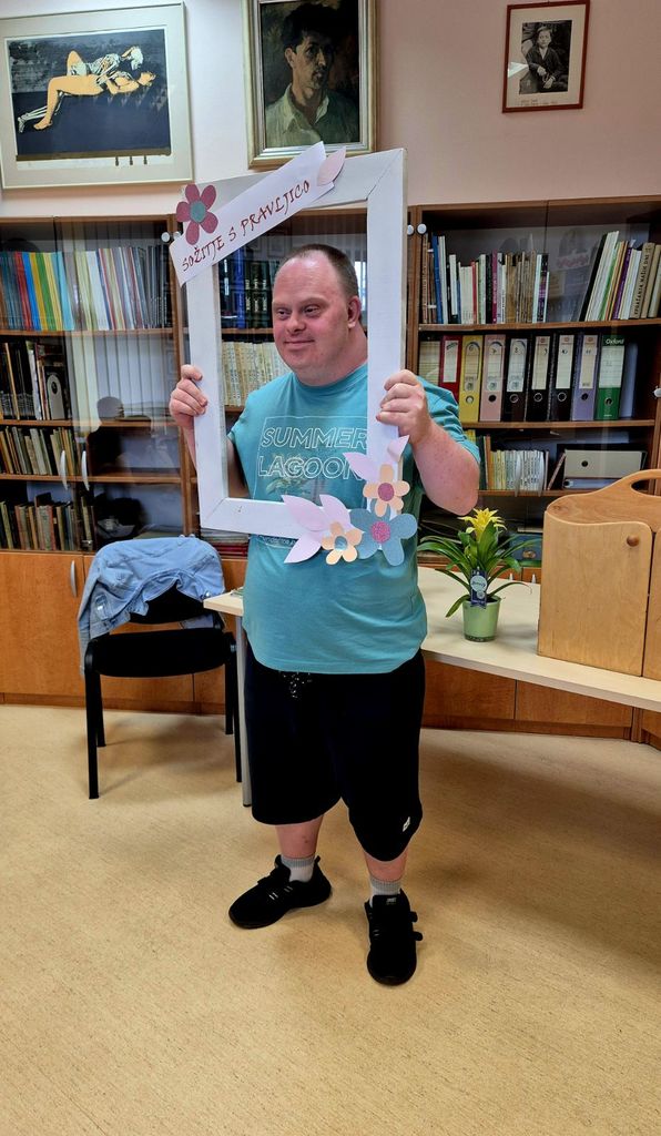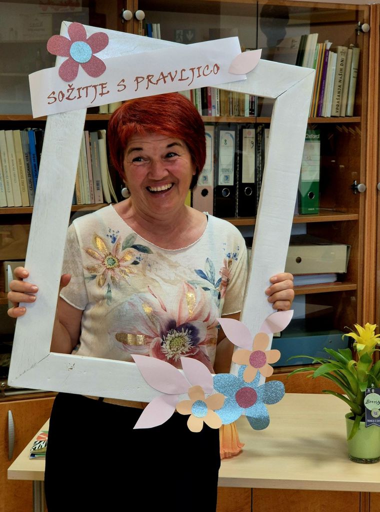 Sledila je podelitev priznanj za sodelovanje na druženjih. Izročala jih je direktorica knjižnice Jolanda Železnik in vsakemu stisnila roko. Za spominsko fotografiranje smo izdelali poseben okvir, nastale so ganljive in spomina vredne fotografije. Nataša Koren, ki bo v novi sezoni prevzela druženja s Sožitjem, je v zaključku prireditve z zabavnimi ugankami razvedrila vzdušje.