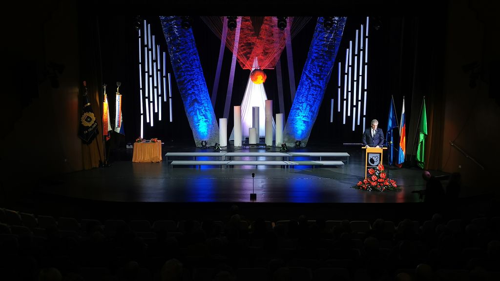 Dom Ii. slovenakega tabora Žalec, 25. april 2024. Slavnostni govornik: Boštjan Poklukar, minister za notranje zadeve. Kulturni program je pripravil MoPZ FaVoZa pod umetniškim vodstvom Gregorja Deleje.